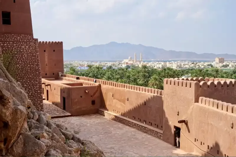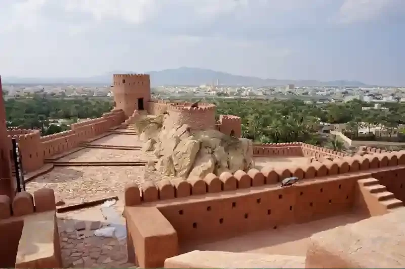 I merli delle fortificazioni spalancano una finestra panoramica sulla fertile pianura di Al-Batinah. Questa posizione privilegiata permette di catturare il suggestivo contrasto tra la severa architettura in pietra e l'ondeggiare verde delle piantagioni di datteri.
