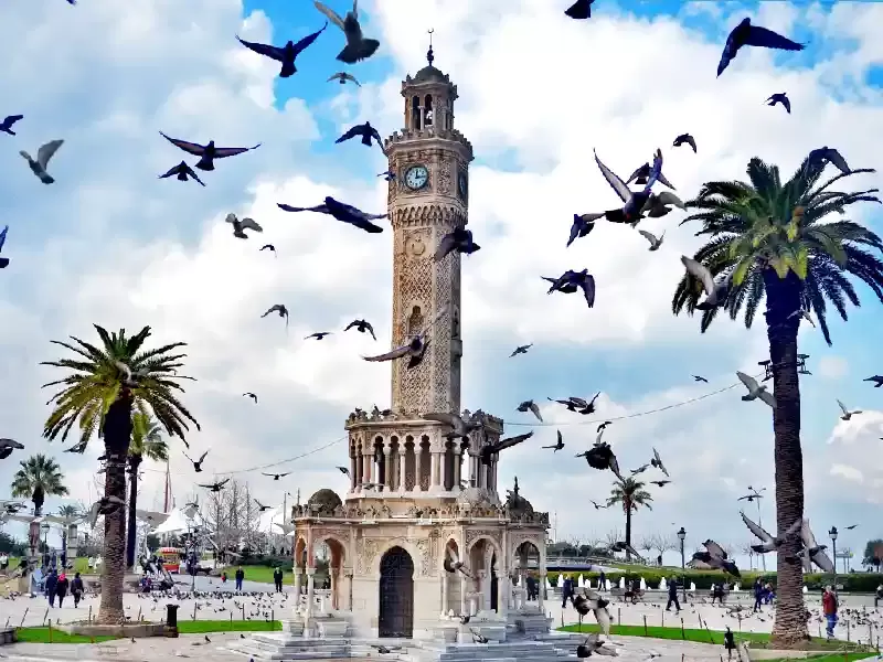 Il simbolo indiscusso di Smirne è la Torre dell'Orologio (Saat Kulesi), un'elegante struttura alta 25 metri che domina Piazza Konak. Costruita nel 1901 in occasione del 25° anniversario dell'ascesa al trono del sultano Abdul Hamid II, la torre presenta quattro orologi nella parte superiore, dono dell'imperatore tedesco Guglielmo II, e quattro fontane alla base. Di sera, illuminata, diventa visibile anche a chilometri di distanza, regalando un colpo d'occhio straordinario.