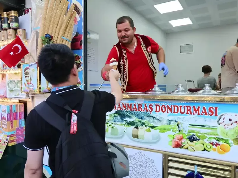 Il dondurma di Kahramanmaraş non è un semplice gelato, ma una preparazione densa ed elastica che si mangia con coltello e forchetta. Questa consistenza unica deriva dal salep (farina di tuberi di orchidea) e dalla gomma arabica. I venditori di dondurma sono famosi per i loro spettacoli acrobatici, in cui sfidano i clienti a prendere il cono gelato. Nonostante il caldo, questo gelato non si scioglie facilmente grazie alla sua particolare composizione.