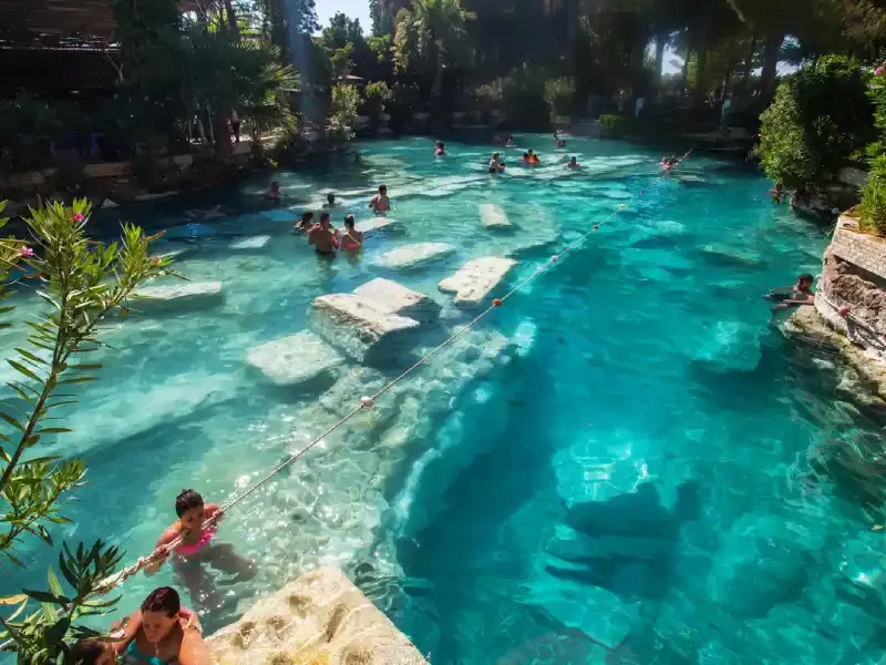 Le acque termali di Pamukkale, ricche di minerali come calcio e ferro, offrono numerosi benefici terapeutici. Sono particolarmente efficaci per alleviare dolori articolari e muscolari, migliorare la circolazione e fornire sollievo a problemi digestivi, reumatici e renali. La temperatura confortevole tra i 36° e i 38°C crea un ambiente ideale per il relax e il benessere.