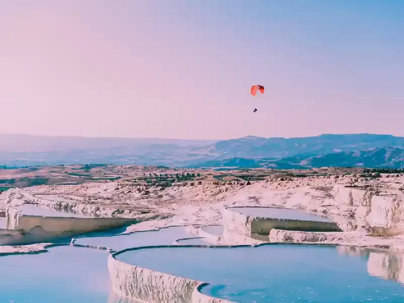 Pamukkale, che in turco significa "castello di cotone", è un sito naturale unico al mondo situato nella provincia di Denizli. Questo spettacolare fenomeno geologico, Patrimonio dell'Umanità UNESCO dal 1988, si estende per ben 2700 metri di lunghezza e 160 d'altezza. I movimenti tettonici hanno causato la nascita di numerose fonti termali ricche di calcio che, nel corso dei millenni, hanno modellato le famose terrazze di travertino bianco.