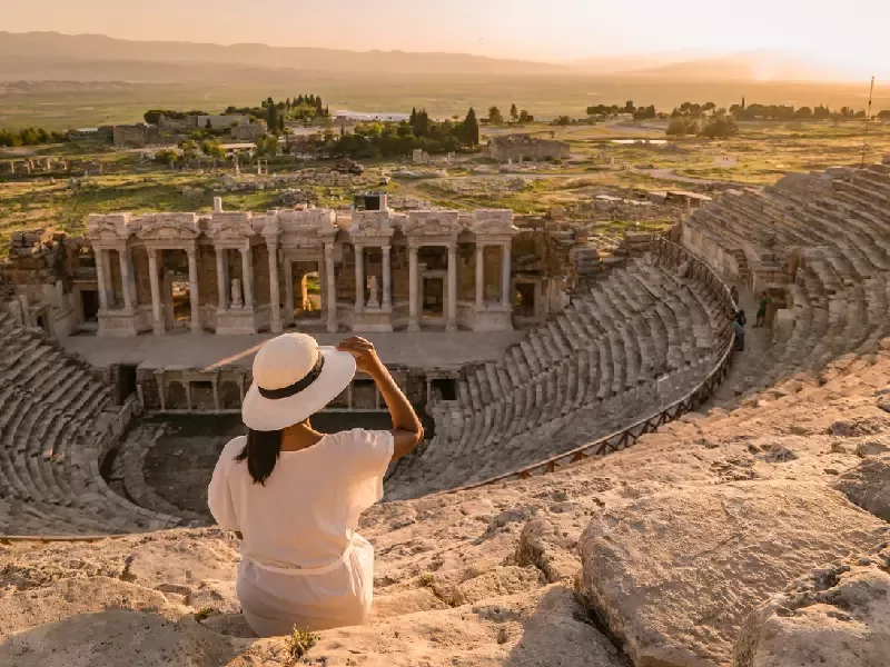 Il Teatro Romano emerge come la struttura più maestosa dell'antica Hierapolis. Edificato durante l'età giulio-claudia, sfruttando parzialmente il naturale pendio collinare e in parte mediante elaborate sostruzioni, poteva accogliere tra i 10.000 e i 12.000 spettatori. La sua architettura segue la tradizione ellenistica, caratterizzata da 26 ordini di gradini in travertino che discendono armoniosamente fino all'orchestra.