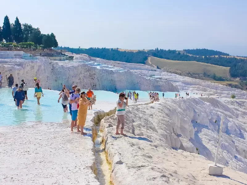 Questo fenomeno, perpetuatosi nei secoli, ha modellato un paesaggio che appare come una fortezza di neve o cascate cristallizzate nel tempo, con piccole piscine levigate dall'incessante fluire dell'acqua termale. L'impressione è quella di trovarsi di fronte a un'imponente struttura di candido cotone, origine etimologica del nome del sito.