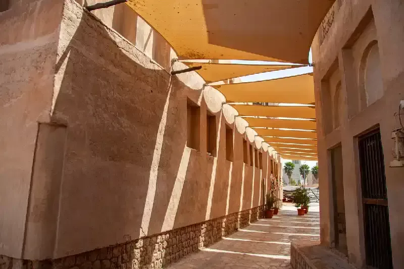 Questi materiali sono stati scelti non solo per la loro disponibilità locale ma anche per le loro proprietà isolanti naturali. Le spesse mura, infatti, creano un microclima confortevole all'interno dell'edificio, respingendo efficacemente il calore esterno. Particolarmente interessante è l'Arish, una casa estiva tradizionale realizzata interamente con foglie di palma intrecciate, che comprende zone living, aree per il riposo e una cucina, tutti arredati con mobili e oggetti d'epoca.