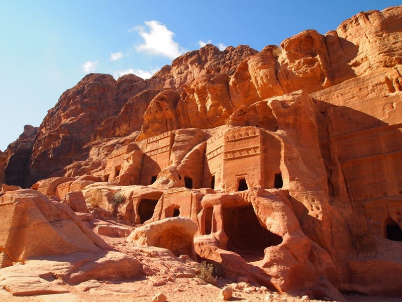 Dopo aver percorso il fantastico Siq, il canyon che conduce al Tesoro, Petra prosegue il suo percorso con la via delle Facciate, nota anche come Siq esterno, che conduce alla seconda monumentale tappa della leggendaria città – il teatro. Lungo questa strada si succedono una serie di tombe in cui la commistione degli stili accolti nell’architettura nabatea (greco, romano, egizio, assiro...) si esprime con decorazioni singolari, in un totale di 44 facciate. Sulla sinistra, dopo una prima parte crollata a seguito degli agenti atmosferici, si levano le facciate di tombe con decorazioni di influenza assira. Sul tetto delle costruzioni, infatti il celebre motivo a scale che salgono e che scendono evoca lo zigurat, che in genere si compone di sette gradini corrispondenti ai sette livelli per raggiungere il più alto paradiso.