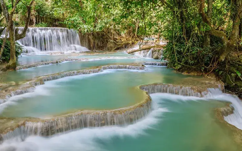 - Cascate di Kuang Si: A 30 km da Luang Prabang, queste cascate a più livelli sono una meraviglia naturale. Piscine turchesi perfette per nuotare, sentieri nella giungla, un centro di salvataggio degli orsi neri asiatici. Puoi andarci in tuk-tuk (tour di mezza giornata 50.000-100.000 kip a persona), moto a noleggio, o tour organizzato. L'ingresso alle cascate costa 20.000 kip.